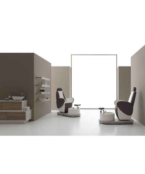 Современное оборудование, подходящее для выполнения различных процедур. Кресло имеет удобное и широкое сиденье, а также регулируемые высокие подлокотники и мягкий подголовник, который обеспечивает максимальный комфорт. Также модель оснащена удобной регулируемой подставкой для ног (регулировка выполняется механическим способом). Обивка выполнена из искусственной кожи. Ванночка белого цвета оснащена душем и смесителем. Для полноценного функционирования оборудования необходимо подключение к водопроводу.Основание выполнено в современном стиле с применением бетонной отделки.